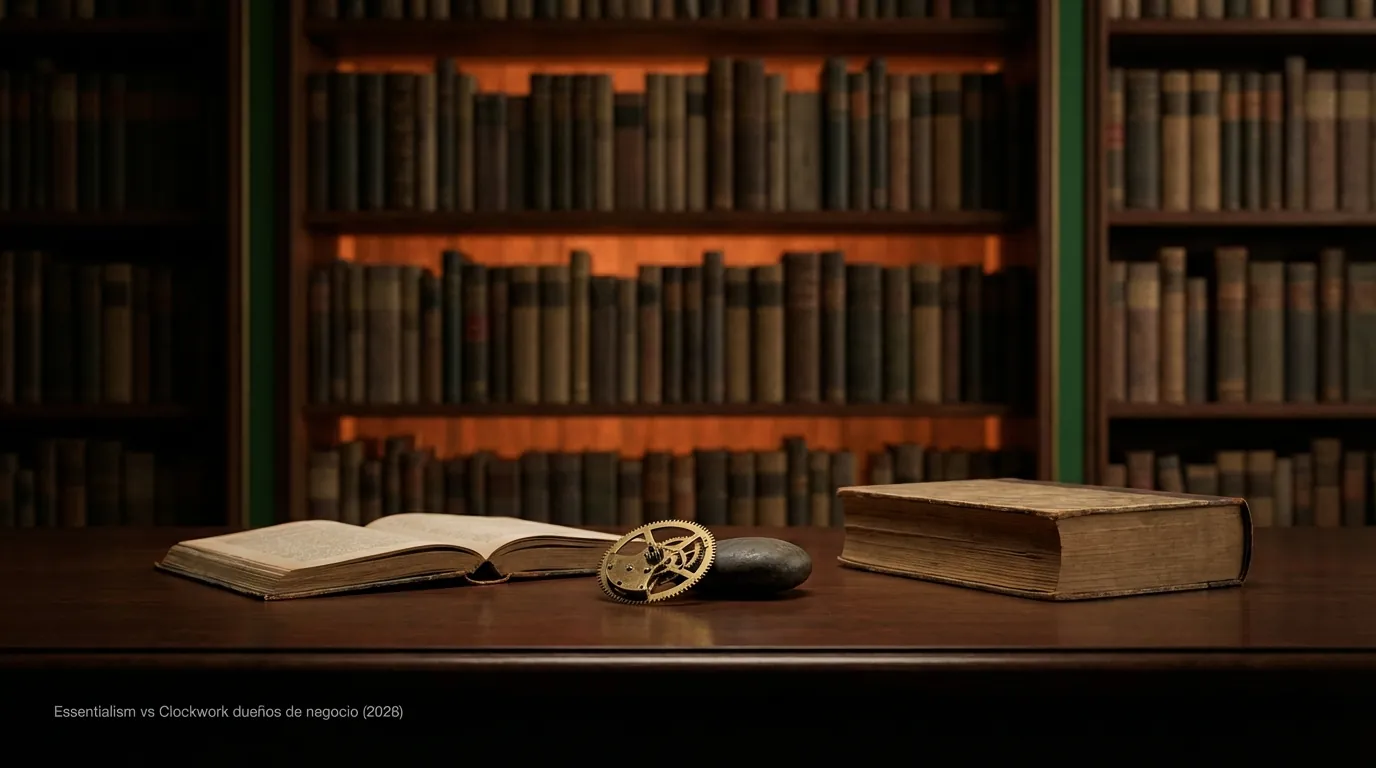 Essentialism fue publicado en 2014 por Greg McKeown para convencer a profesionales de que hacer menos es hacer más. Clockwork fue publicado en 2018 por Mike Michalowicz con un objetivo diferente: que el negocio pueda funcionar sin el dueño. Ambos libros abordan partes reales del problema de quien dirige un negocio de servicios. Ninguno lo resuelve completo.